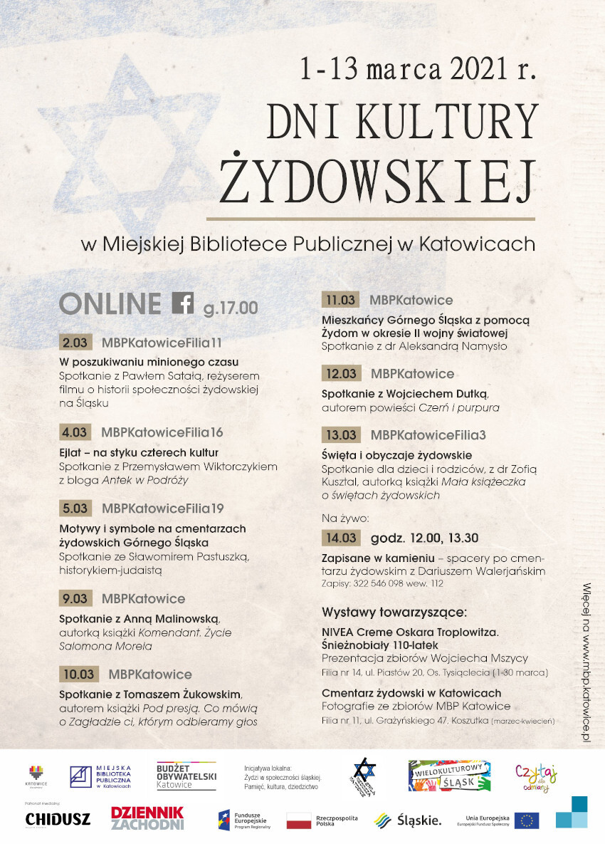 Miejska Biblioteka Publiczna w Katowicach po raz piąty organizuje Dni Kultury Żydowskiej – święto żydowskiej kultury, sztuki i historii. Ze względu na obostrzenia związane z pandemią, po raz pierwszy wszystkie spotkania transmitowane są online na oficjalnym profilu Biblioteki na Facebooku oraz YouTube, zawsze o godz. 17.00.