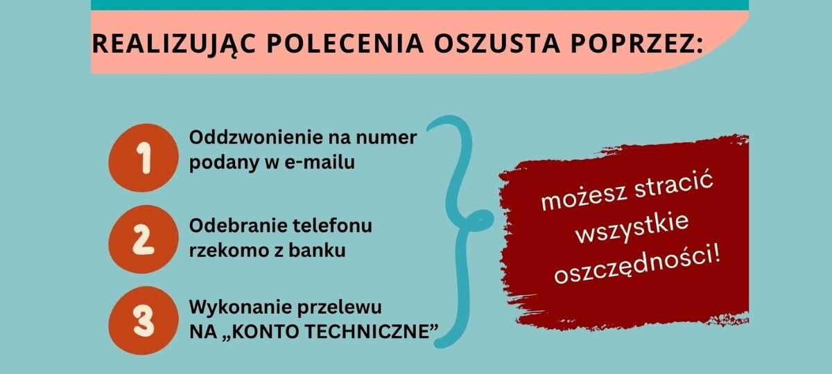 Fałszywy „konsultant” przekonuje, że ktoś próbował wykonać nieautoryzowane przelewy. Aby „zabezpieczyć środki”, nakazuje przelać pieniądze na tzw. konta techniczne. W rzeczywistości są to rachunki przestępców, z których środki natychmiast znikają.
