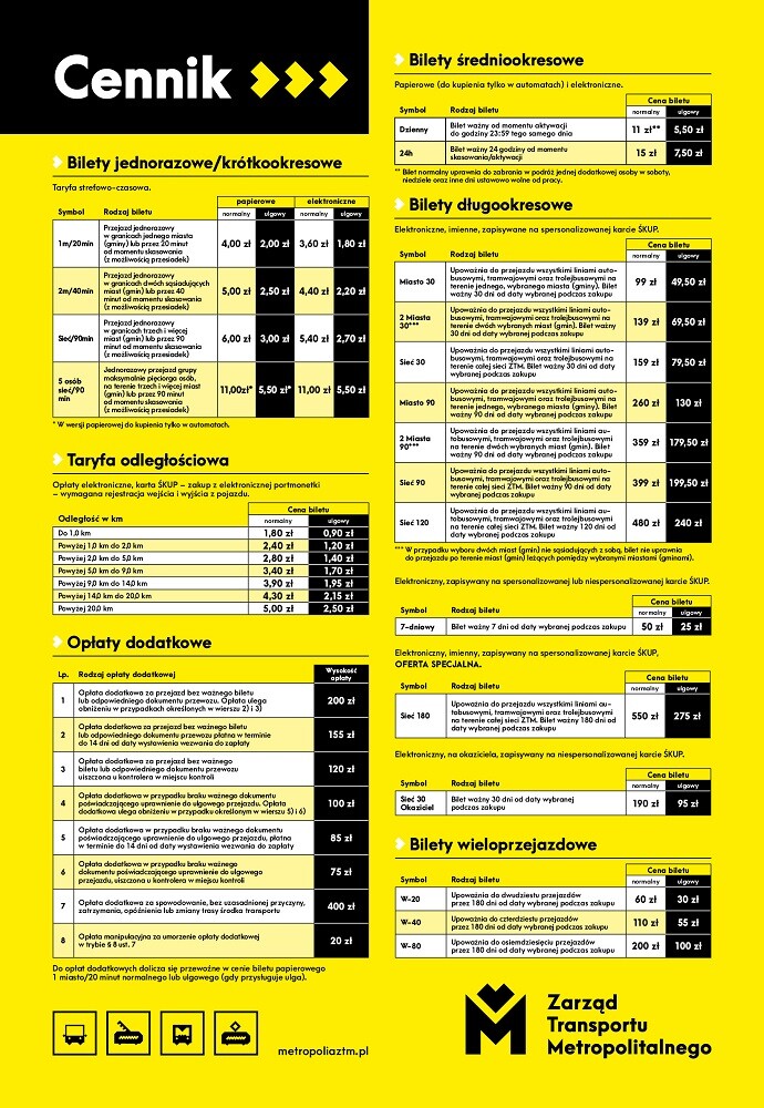Treść nowej taryfy, cennik oraz szczegóły zmian można znaleźć na stronie internetowej ZTM w zakładce Kup bilet lub ŚKUP - Taryfa przewozu (od 19 kwietnia 2021) i Cennik (od 19 kwietnia 2021). Zestawienie najważniejszych informacji zostało także przedstawione na poniższej grafice.