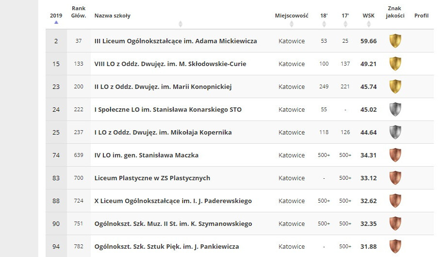 W rankingu maturalnym liceów mamy pięć szkół z Katowic: III Liceum Ogólnokształcące im. Adama Mickiewicza (35. miejsce, awans z 63. w 2018 roku), VIII LO z Oddz. Dwujęz. im. M. Skłodowskie-Curie (144. miejsce, spadek ze 118. w 2018 roku), II LO z Oddz. Dwujęz. im. Marii Konopnickiej (194. miejsce, awans spoza najlepszej 200.), I Społeczne LO im. Stanisława Konarskiego STO (229. miejsce, spadek z 48. w 2018 roku), I LO z Oddz. Dwujęz. im. Mikołaja Kopernika (249. miejsce, spadek ze 127. w 2018 roku).