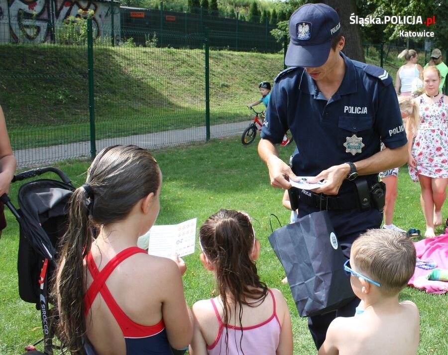 Katowiccy policjanci wraz z funkcjonariuszami Straży Miejską w Katowicach przeprowadzili działania profilaktyczne pn. „Mamo, Tato Nie zgub mnie” na kąpielisku zlokalizowanym na orliku przy ul. Gliwickiej.