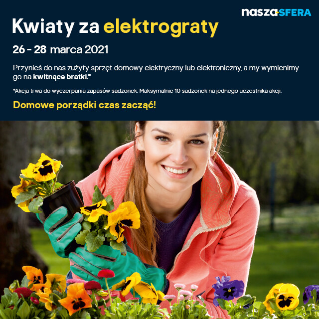 Masz zużyty sprzęt elektroniczny lub elektryczny? Zalega Ci stary monitor, komputer, telefon, lodówka, czy pralka? Castorama organizuje akcję „Kwiaty za Elektrograty”, czyli zbiórkę elektrośmieci w dniach 26-28 marca. W zamian za zużyty sprzęt dostaniesz piękne bratki.