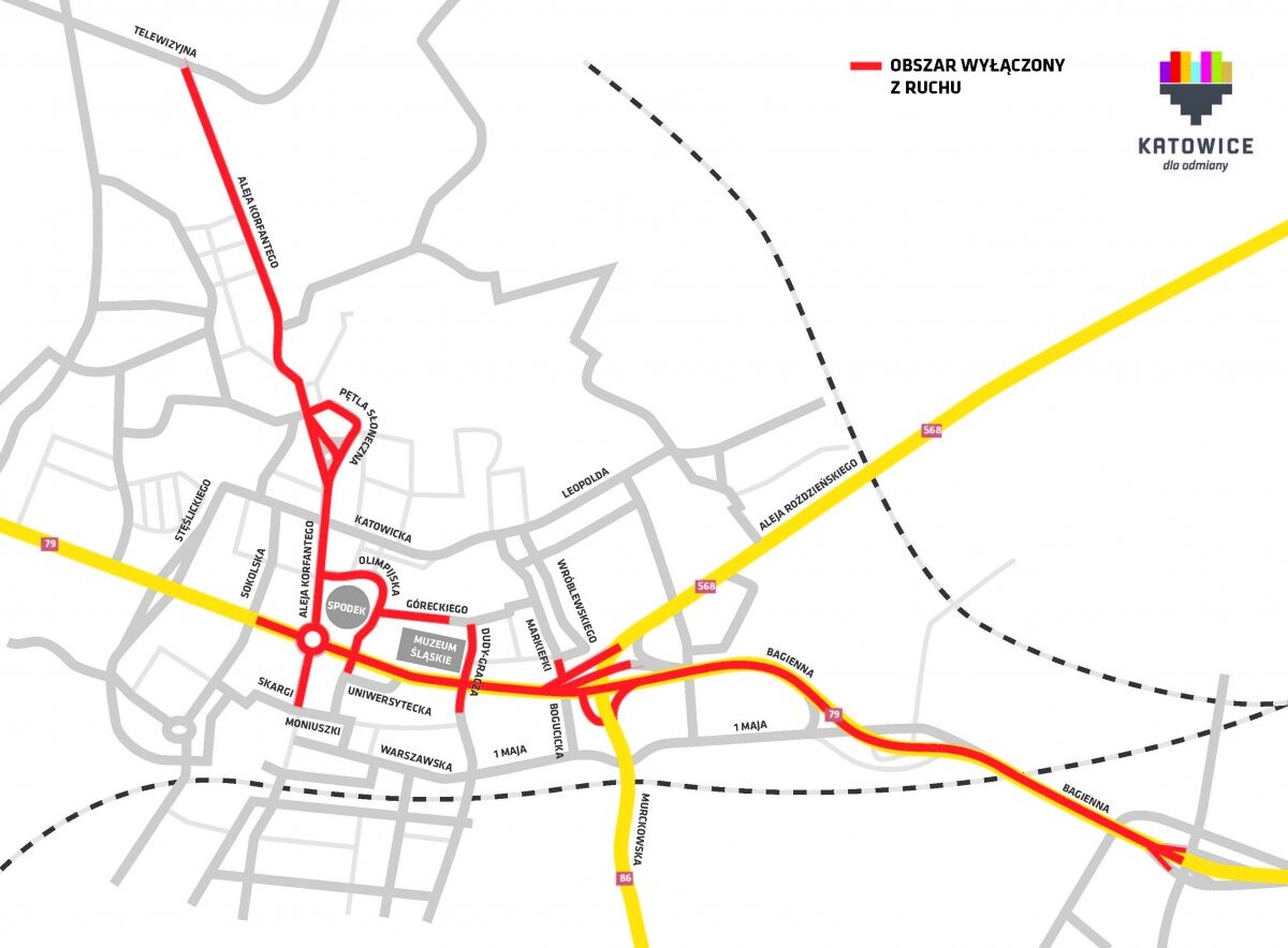 Ze względu na strefy całkowicie wyłączone z ruchu osoby przemieszczające się na kierunkach np. od/do dworzec PKP <-> plac pod Spodkiem powinny skorzystać z rekomendowanych obejść. Dla ruchu pieszego będą dopuszczone przejścia przez zamknięte dla ruchu ulice (tj. Al. Korfantego i Al. Rozdzieńskiego):