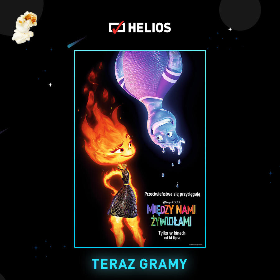 Helios zaprasza także na kino familijne! Animacja „Między nami żywiołami” Disneya i Pixara to pełnometrażowy film opowiadający o Mieście Żywiołów, gdzie obok siebie mieszkają przedstawiciele czterech nacji - Ognia, Wody, Ziemi i Powietrza. Iskra - twarda, wygadana i wybuchowa dziewczyna - zaprzyjaźnia się z pogodnym, choć nieco ciapowatym i łzawym Wodkiem. Nowa znajomość zmusza ją do zrewidowania poglądów na życie!