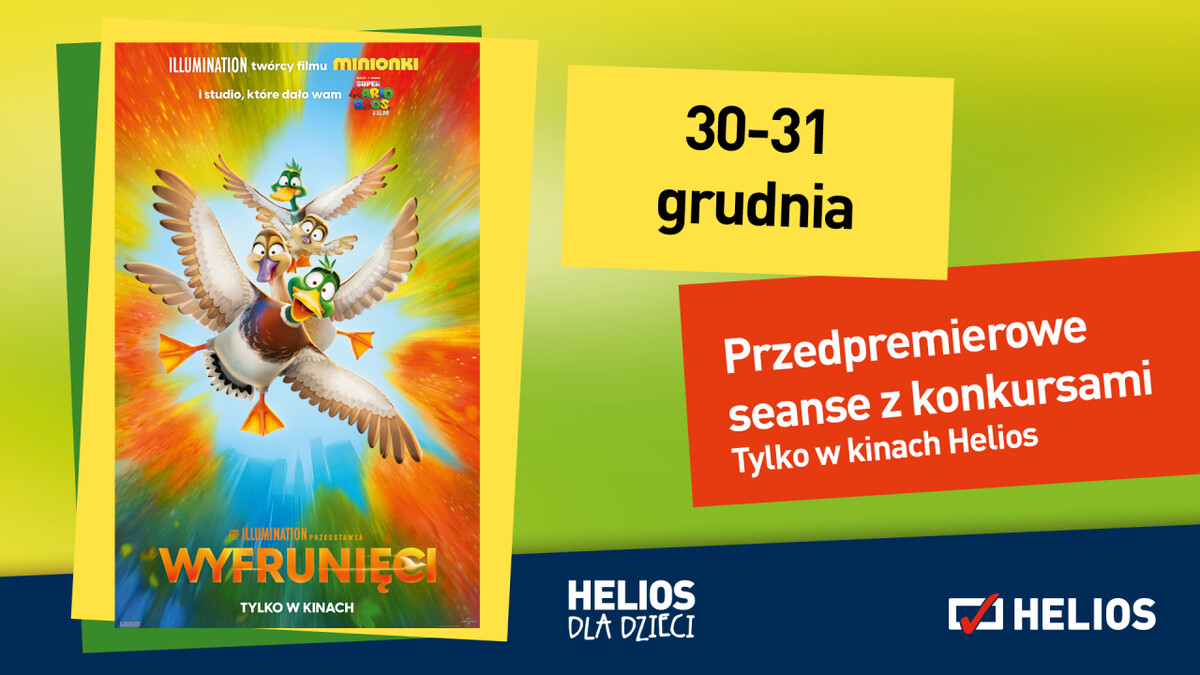 W tym samym terminie Helios zaprasza także na przedpremierowe pokazy bajki „Wyfrunięci”. Rodzina kaczek mieszka spokojnie w Nowej Anglii. W mamie budzi się jednak zew przygody i rusza z mężem oraz dziećmi w podróż przez Nowy Jork na Jamajkę! To wzruszająca opowieść o znaczeniu rodziny, przygodzie i możliwości wyjścia ze swojej strefy komfortu. Podczas ostatniego weekend roku, o godzinie 10 i 12:15 odbędą się też specjalne seanse tej produkcji poprzedzone licznymi konkursami.