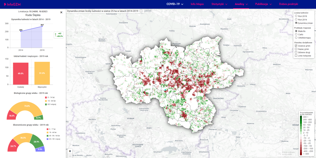 Rozpatrując w ten sposób zmianę liczby ludności (między rokiem 2014 i 2019), dokładnie widoczne jest w jakich poszczególnych częściach gmin GZM liczba mieszkańców rośnie, a w jakich maleje. Na mapie dostępne są 3 warstwy: liczba ludności z początku 2019 r., z końca 2014 r. oraz dynamika zmian. Po wybraniu z mapy konkretnego heksagonu pojawią się ponadto dodatkowe informacje dotyczące ludności w danym obszarze: dynamika zmian liczby mieszkańców, udział kobiet i mężczyzn oraz biologiczne i ekonomiczne grupy wieku.