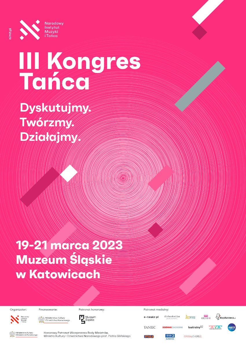 W dniach 19-21.03.2023 w Katowicach odbędzie się III Kongres Tańca. Jego organizatorem jest Narodowy Instytut Muzyki i Tańca a partnerem wydarzenia – Muzeum Śląskie w Katowicach.