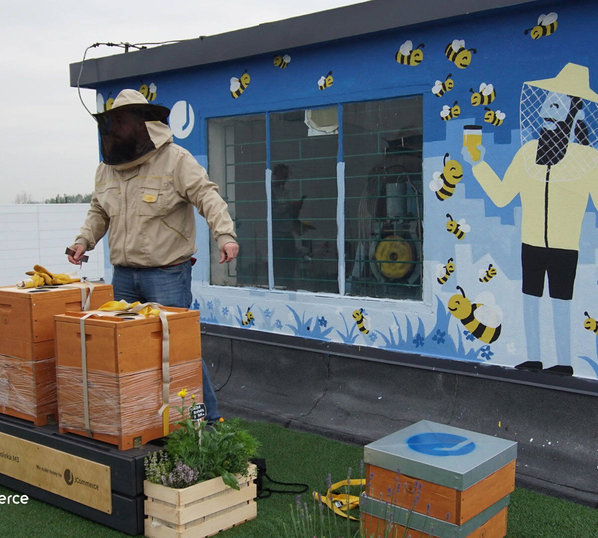 Firma JCommerce od lat angażuje się w inicjatywy wspierające zrównoważony rozwój, w tym celu wspiera akcje charytatywne, przekazuje sprzęt elektroniczny oraz meble biurowe szkołom i instytucjom pomocowym, zrezygnowała z dystrybutorów wody w plastikowych butlach oraz realizuje program oszczędzania energii. Budowa pasieki jest więc kolejnym krokiem w tym kierunku.