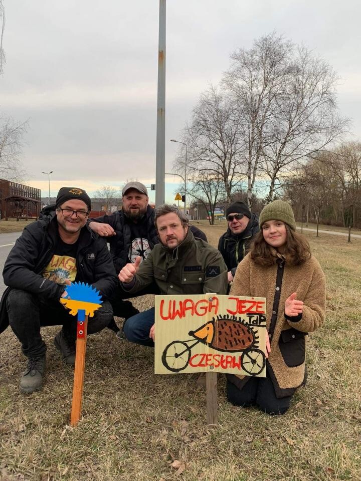 Obok tabliczek prostokątnych zostały ustawione jeże wycięte z metalu. Część z nich została pomalowana na kolory ukraińskiej flagi, aby okazać wsparcie w toczącej się wojnie. W produkcji metalowych jeży pomaga zaprzyjaźniona firma, która wycina je na maszynie, natomiast pan Sebastian sam je maluje i skręca. Dodatkowo są one wyposażone w odblaski, które dostarczyła firma produkująca karetki.