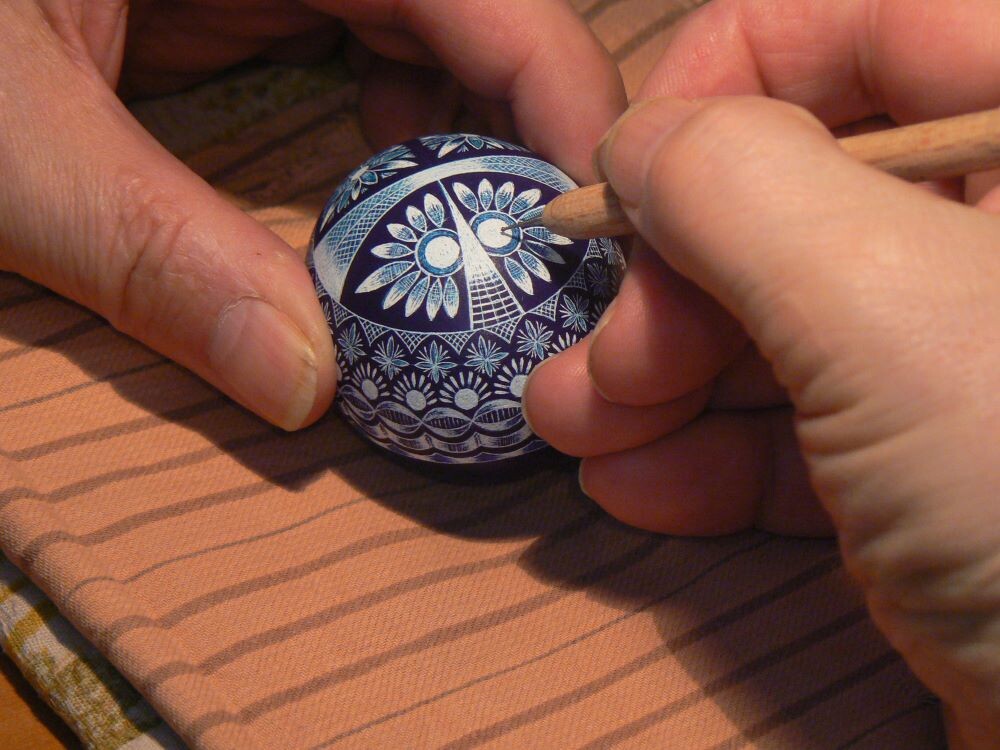 L. Jęczmyk: Ja oczywiście mam swoją ulubioną technikę. Jest to ta, od której u mnie wszystko się zaczęło, czyli wspomniane wcześniej wydrapywanie, a bardziej fachowo metoda rytownicza. Ta metoda po prostu mi „leży” i w niej czuję się najlepiej. Inspiracji szukam na każdym kroku, obserwując wszystko, co mnie otacza. Początkowo jajka barwiłem wyłącznie w łupinkach cebuli uzyskując różne odcienie brązu. Wzorki i scenki wydrapywałem przedmiotami metalowymi i w miarę ostrymi. Nie dawało mi to pełnej satysfakcji, bo rylec często ślizgał się po skorupce. Wtedy wymyśliłem przyrząd, który okazał się tym, o co mi chodziło. Była to igła z odłamanym uszkiem wbita w drewnianą obsadkę. Odłamany koniec zaostrzyłem pod kątem na osełce. Na końcu igły powstawał owal o bardzo ostrych krawędziach. Całość przypomina pióro lub ołówek. W ten sposób zrobiłem sobie doskonałe narzędzie, które stanowiło przełom w mojej działalności kroszonkarskiej. Tym narzędziem mogłem wydrapywać naprawdę precyzyjne elementy. Co pewien czas igłę trzeba było ostrzyć i temperować koniec obsadki, bo igła przez ostrzenie się skracała. Teraz mam jeszcze doskonalszy przyrząd, którego nie trzeba ostrzyć. W miejsce igły jest wetknięty stalowy pręcik z końcówką widiową o różnej wielkości, który można kupić w sklepach zaopatrzenia stomatologicznego, ale żeby nie komplikować sprawy, bo z zakupem czegoś takiego mogą być problemy, polecam opisany wyżej przyrząd zrobiony z igły. Podsumowując powiem tylko - żeby efektywnie skrobać zabarwioną skorupkę jajka, rysik musi być twardy i bardzo ostry. Dodam jeszcze, że wydmuszki barwię w farbach do tkanin – mam swoją ulubioną firmę! One się nadają do barwienia białych skorupek. Te farby dają mi możliwość cieniowania, czyli uzyskiwania nieraz dwóch bladszych odcieni koloru zasadniczego. Same wydmuszki robię przy użyciu strzykawki lekarskiej.