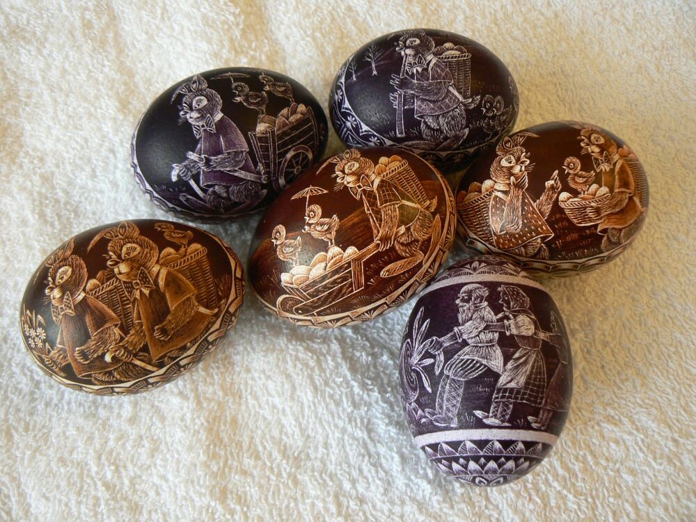 L. Jęczmyk: Ja moje prace wykonuję na jajkach kurzych, średniej wielkości. Jajka do moich prac muszą być białe, foremne i gładkie, bez chropowatości. Tu muszę dodać, że przez wiele lat robiłem na pełnych jajkach gotowanych na twardo, ale od kilku lat za namową kolegi i zarazem konkurenta robię na wydmuszkach. Jest wielka różnica na korzyść wydmuszek. Żałuję tylko, że tak późno dałem się przekonać. Jajko pełne czy wydmuszka musi być zafarbowane i dobrze wysuszone. Potem można przystąpić do części artystycznej, czyli skrobania jajka, uruchamiając przy tym swoją wyobraźnię. Ja co pewien czas kupuję 10 lub 20 jajek białych i wedle potrzeb robię z nich wydmuszki, zużywając wnętrze do różnych celów jak jajecznica czy materiał do wypieków żony. Nic się nie zmarnuje, a ja mam wydmuszki do farbowania i potem do zdobienia. Robienie wydmuszek, ich płukanie i farbowanie nazywam czarną robotą a samo skrobanie nazywam częścią artystyczną. Ta ostatnia faza daje mi najwięcej satysfakcji. Teraz należałoby wspomnieć o narzędziach, ale o tym opowiem nieco później. Wspomnę tylko, że przy robieniu wydmuszek bardzo istotna rolę odgrywa strzykawka lekarska!