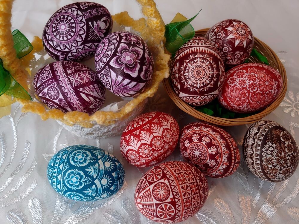 L. Jęczmyk: Nadszedł moment by uporządkować nazewnictwo. Na ogół na zdobione jajka wielkanocne mówi się albo pisanki, albo kraszanki, a na Górnym Śląsku kroszonki. Ja też tak mówiłem do czasu kiedy nam to wytłumaczyli etnografowie w Muzeum w Gliwicach, bo między pisankami a kroszonkami jest istotna różnica. Pisanki to są jajka pisane płynnym woskiem. W naczyńku ustawicznie podgrzewanym np. świecą znajduje się roztopiony wosk. Nabiera się go specjalną igłą albo dozownikiem z rureczką i maluje się nim na skorupce jajka elementy zdobnicze. Po stężeniu wosku jajko zanurza się w farbie aby pole nie pokryte woskiem zabarwiło się. Potem wosk się delikatnie zdrapuje i pojawiają się niezafarbowane pola w formie wzorku. Jeśli to jest pierwsze barwienie to zdrapane pola są koloru skorupki jajka. Potem roztopionym woskiem maluje się kolejne elementy zdobnicze i jajko zanurza się w farbie o innym kolorze. Czynności te powtarzamy w zależności od tego ile przewidujemy kąpieli jajka w różnych farbach. Po ostatnim zdrapaniu wosku, mamy jajko pokryte różnokolorowymi wzorkami. W ten sposób powstaje pisanka. Kroszonki to jajka zdobione metodą rytowniczą. Jajko jest zabarwione na jeden kolor i po jego wyschnięciu ostrym narzędziem wydrapuje się na nim wzorki odsłaniając w ten sposób naturalny kolor skorupki. Tak powstaje kroszonka. To są dwie najpopularniejsze metody zdobienia jaj. Popularne są też oklejanki. Jajka smaruje się klejem i okleja je kolorowymi papierkami, kolorową włóczką lub zafarbowanymi uprzednio gąbczastymi wnętrzami traw sitowia. Można tez oklejać kolorowymi kamyczkami albo drobnymi paciorkami w zależności od inwencji twórcy. Coraz popularniejsze staje się ostatnio robienie jaj ażurowych. Te robi się wyłącznie na wydmuszkach. W dobrze wypłukanej i wyschniętej wydmuszce przewierca się specjalną mini wiertareczką otworki różnych kształtów, tworząc w ten sposób ażurowe wzorki. Z wydmuszki powstaje coś w rodzaju siatki. Takie cudeńka efektownie prezentują się odpowiednio podświetlone. Jajka zdobione inaczej niż pisanki i kroszonki nie maja specjalnych nazw. Mówi się na nie, że są zdobione metodami nowatorskimi.