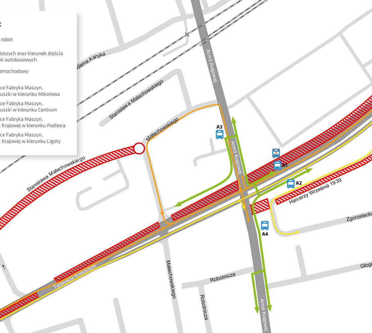 - Wykonawca przystąpi do prac po północnej stronie ul. Kościuszki, gdzie wykona m.in. mury oporowe, podpory wiaduktów oraz sieci uzbrojenia podziemnego, które pozwolą zrealizować w tym miejscu dwupoziomowe skrzyżowanie – mówi Ewa Lipka, rzecznik prasowy urzędu miasta. – W związku z zakresem prac od czwartku 14 lutego największe zmiany czekają pieszych. Chodnik wzdłuż ul. Armii Krajowej od strony Mikołowa na odcinku od ul. Robotniczej do przystanku autobusowego „Piotrowice Fabryka Maszyn 3" zostanie wyłączony za wyjątkiem dojść do posesji. Dlatego osoby udające się na ten przystanek będą musiały skorzystać z wyznaczonych obejść drugą stroną ul. Armii Krajowej do utworzonego przejścia dla pieszych na wysokości tego przystanku – wyjaśnia rzecznik i dodaje, że przystanki, za wyjątkiem znajdującego się na ul. Kościuszki, dla pasażerów jadących w stronę Mikołowa pozostają w starych niezmienionych lokalizacjach. Przystanek „Fabryka Maszyn 1" zostanie przeniesiony poza obszar prac prowadzonych wzdłuż ul. Kościuszki, na której także zostanie przesunięty ruch kołowy. Samochody będę korzystać z tymczasowej jezdni, przy czym utrzymane zostają cały czas po dwa pasy w każdym kierunku jazdy.
