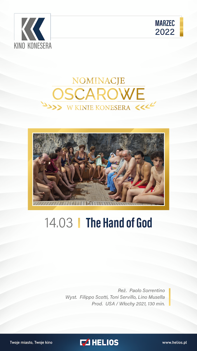 W poniedziałek, 14 marca Kino Konesera przedstawi widzom film „The Hand of God” uhonorowanego Oscarem® scenarzysty i reżysera Paolo Sorrentino. Twórca zabierze widzów w podróż do czasów swojej młodości spędzonej w Neapolu lat 80-tych. Przedstawia miejsca, ludzi, filmy i zdarzenia, które ukształtowały go jako człowieka i artystę. Wspaniała ponad 2-godzinna sentymentalna podróż, która momentami bawi do łez specyficznym poczuciem humoru, wzrusza i daje do myślenia na długo po napisach końcowych.