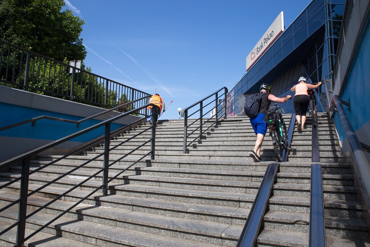 Zaprojektowany zjazd zawęzi istniejące schody przejścia podziemnego. W pierwszej kolejności zostaną wykonane prace rozbiórkowe istniejących schodów w miejscu projektowanego zjazdu, co pozwoli na wykonanie konstrukcji oporowej, w której zlokalizowany będzie ciąg pieszo-rowerowy.