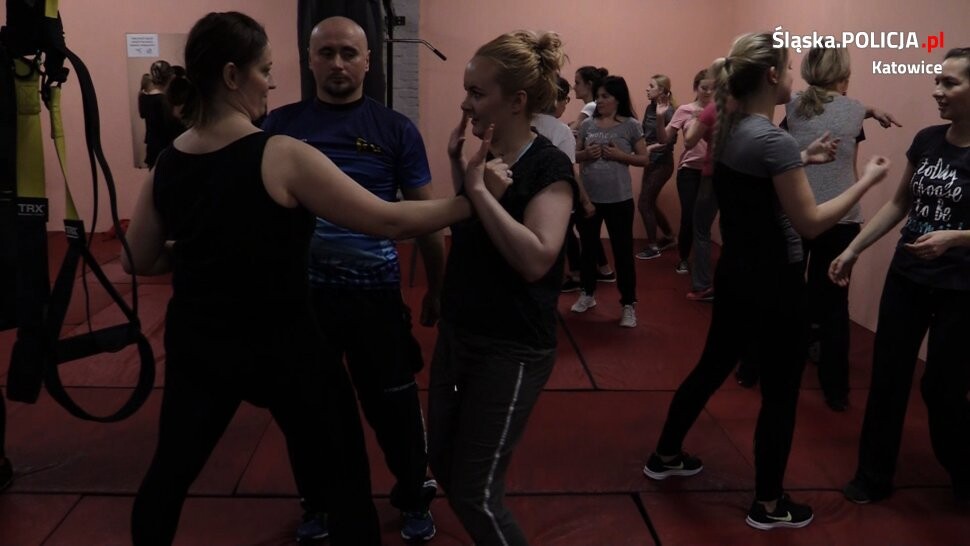 St. asp. Adrianna Mazur z Zespołu Profilaktyki Społecznej Wydziału Prewencji KMP w Katowicach przypomniała o zasadach dotyczących bezpiecznych zachowań, unikaniu zagrożeń, jak również sposobach i miejscach, w których można uzyskać pomoc w przypadku stania się osobą pokrzywdzoną przestępstwem. Na zajęciach poruszono również temat przemocy m.in seksualnej i dyskutowano o przestępstwie stalkingu. Następnie wyposażone w teorię panie miały okazję nauczyć się, już w praktyce, jak obezwładnić agresywnego napastnika. Mundurowi, na co dzień szkolący innych policjantów w zakresie taktyk i technik interwencji - kom. Sebastian Hulin, asp. Dariusz Klocek, sierż. szt. Zbigniew Paradecki z komendy miejskiej, rozpoczęli zajęcia fizyczne. Panie poznały przydatne chwyty obezwładniające, kopnięcia, sposoby obrony przed duszeniem oraz inne porady związane z odpieraniem ataków. W trakcie tego spotkania policjanci zaprezentowali również urządzenia służące do samoobrony oraz przekazali wiedzę na temat bezpiecznych zachowań.