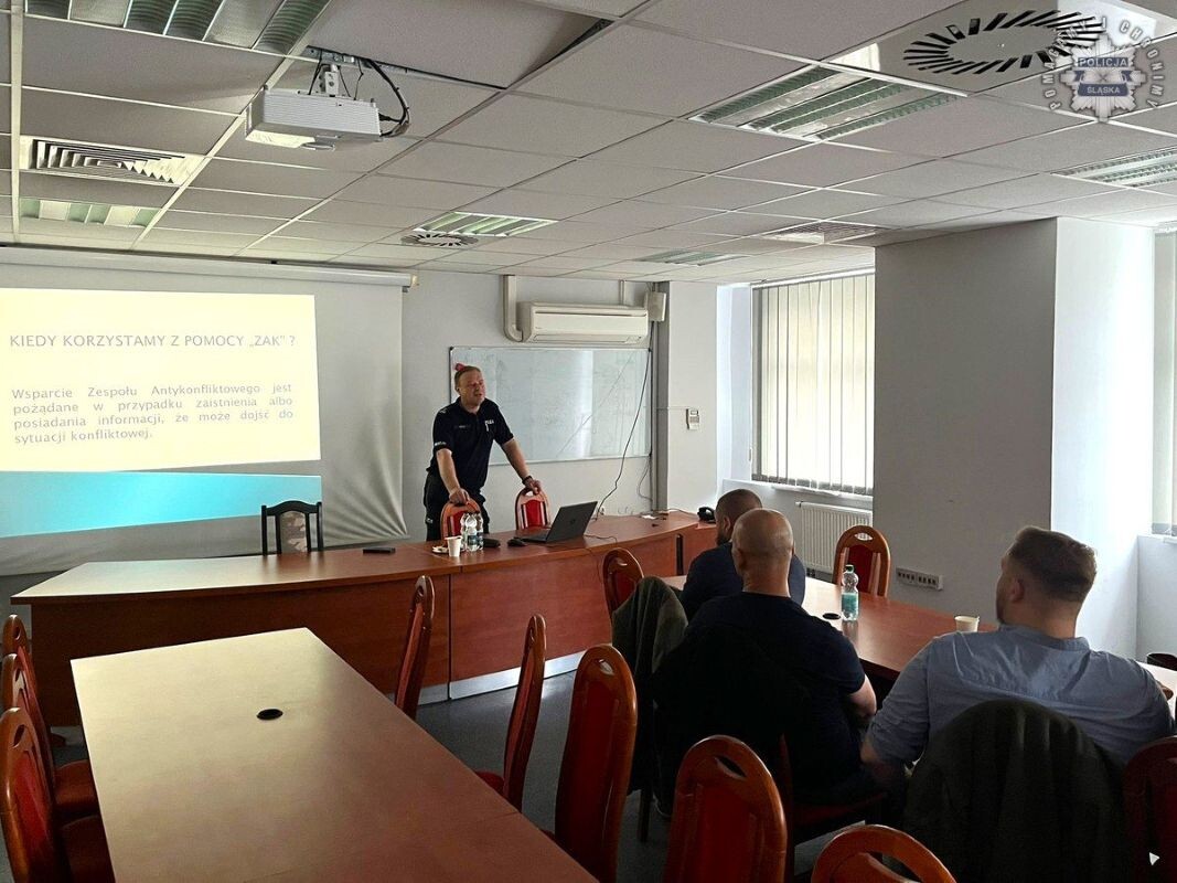 W siedzibie śląskiej Policji odbyło się specjalistyczne szkolenie dla policjantów z Zespołów Antykonfliktowych z Katowic i Krakowa. Spotkanie, prowadzone przez mł. insp. dr. Artura Ormana, miało na celu doskonalenie umiejętności zarządzania napięciami oraz pokojowego rozwiązywania konfliktów, a także wymianę wiedzy i doświadczeń między funkcjonariuszami obu komend.