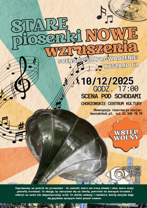 STARE piosenki - NOWE wzruszenia, to podróż do przeszłości-do melodii, które nie tracą blasku i słów, które wciąż potrafią wzruszać.To okazja, by zatrzymać saię na chwilę, powrócić do dawnych brzmień i odkryć na nowo ich niepowtarzalny urok.To chwila zadumy i radości,w której muzyka staje się językiem łączącym ludzi ponad czasem.