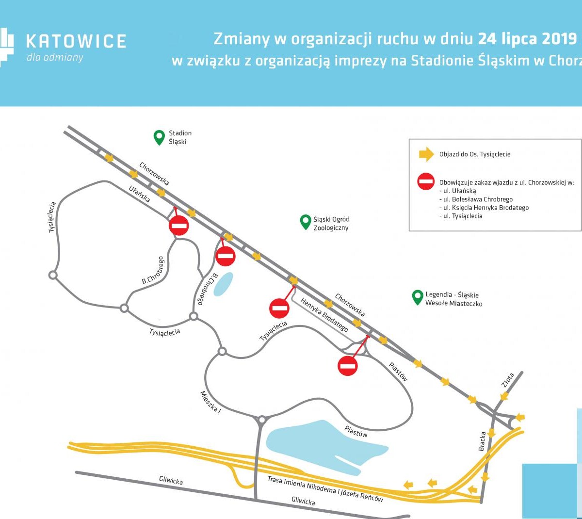 Ponadto w dniu 24 lipca 2019 roku, będzie obowiązywać zmieniona organizacja ruchu. Wzdłuż ul. Chorzowskiej - na odcinku od ul. Złotej do granicy z Chorzowem zostaną wprowadzone dodatkowe zakazy zatrzymywania i postoju. Analogiczne oznakowanie zostanie wprowadzone na ul. Brackiej od Drogowej Trasy Średnicowej do ul. Chorzowskiej. Dodatkowo do znaków zostanie dołączona tabliczka T-24, tj. odholowanie pojazdu przed służby miejskie w przypadku naruszenia zakazu.